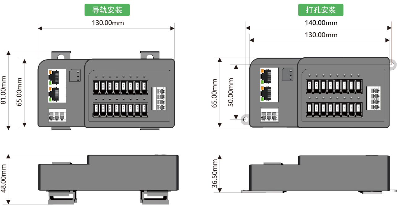 安裝方式:DIN35導(dǎo)軌安裝或雙側(cè)耳打孔安裝